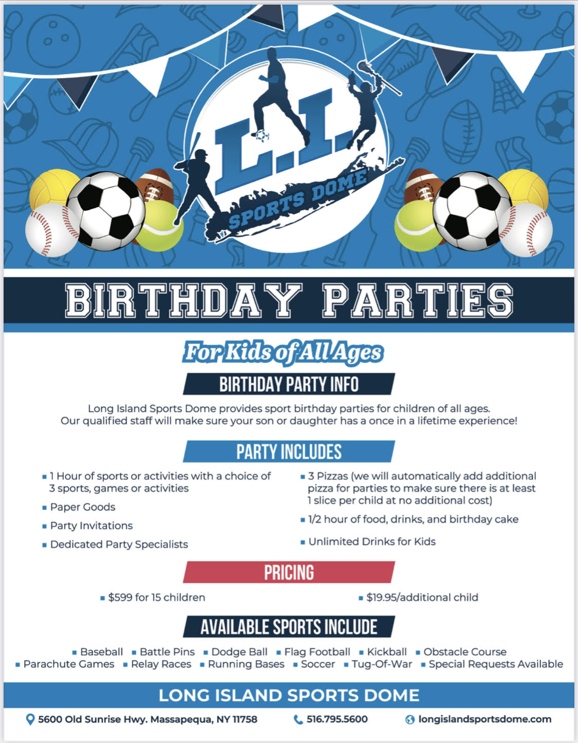Long Island Sports Dome provides sports birthday parties for children of all ages. Our qualified staff will make sure your son or daughter has a once in a lifetime experience! Please contact us in the form below to inquire about a birthday party!